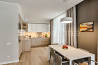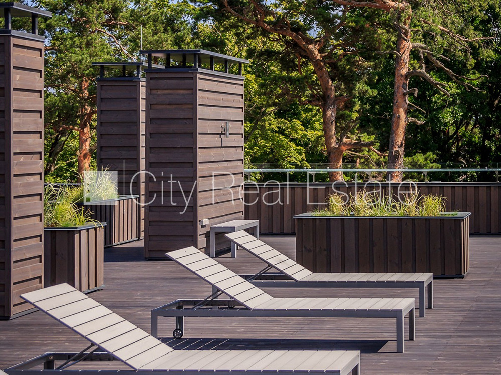Jaunceltne, fasādes māja, zaļā teritorija, labiekārtots apzaļumots pagalms, teritorijas iebrauktuves vārti aprīkoti ar automatizētu atvēršanās un aizvēršanās sistēmu, vieta automašīnai, ieeja no ielas, apzaļumota teritorija ar jaunu kokaugu stādījumiem, ir lifts, balkons 9 m2, jumta terase, istabas izolētas 2 gab., studio tipa, virtuve apvienota ar viesistabu 44,6 m2, garderobe, pilnā apdare, apsildāma grīda vannas istabā, lielie skatlogi, iebūvēti gaismas ķermeņi, koka dēļu grīdas segums, flīžu grīdas segums, divi sanitārie mezgli, vanna, dušas kabīne, iebūvēta virtuves iekārta, iebūvēti sienas skapji, stūra dīvāns, divguļamā gulta, televizors, ledusskapis, trauku mazgājamā mašīna, indukcijas plīts, cepeškrāsns, veļas mašīna, internets, diennakts videonovērošana, iespējama gultasveļas maiņa, iespējama telpu uzkopšana, izīrē ar visu bildēs redzamo aprīkojumu, atbrīvots, stratēģiski izdevīga vieta, līdz jūrai 200 m, cena vasaras sezonā - 5800.00 EUR, CITY REAL ESTATE ID - 517146