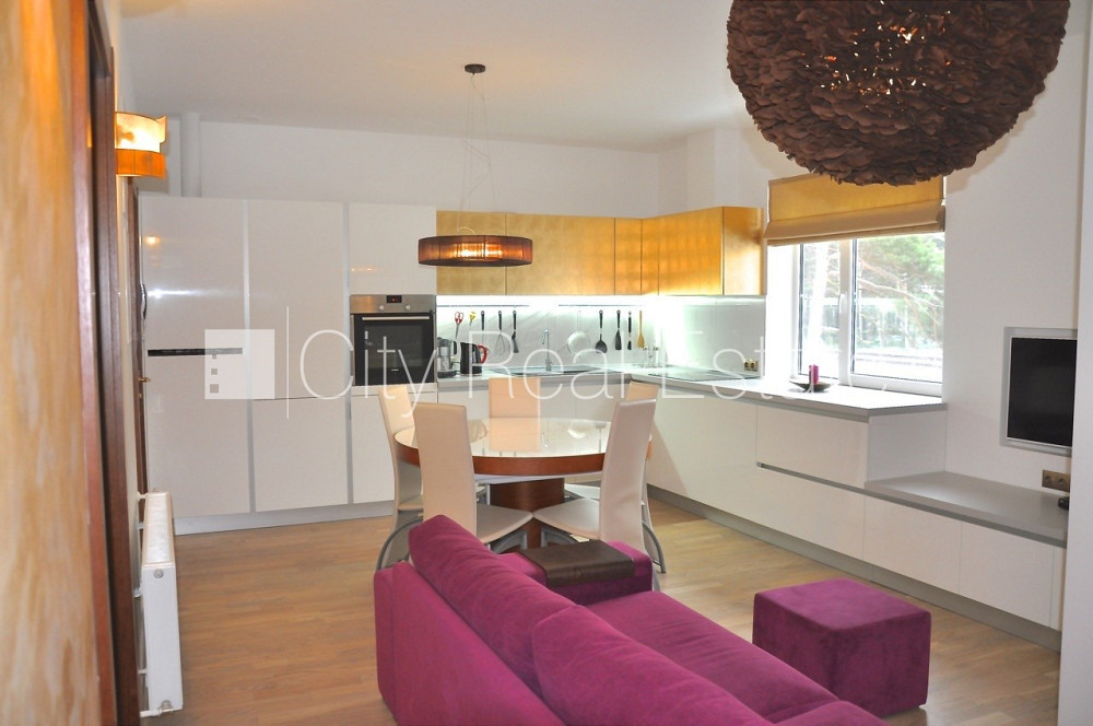 Iežogota teritorija, vieta automašīnai, terase, istabas izolētas 2 gab., studio tipa, virtuve apvienota ar viesistabu, boilers karstajam ūdenim, apsildāma grīda vannas istabā, krāsotas sienas, jauna santehnika, parketa grīda, dušas kabīne, džakūzī vanna, bidē, iebūvēta virtuves iekārta, iebūvēti sienas skapji, divguļamā gulta, atpūtas krēsli, televizors, ledusskapis, trauku mazgājamā mašīna, elektriskā plīts, cepeškrāsns, tvaika nosūcējs, veļas mašīna, satelīta televīzija, internets, kāpņu telpā koda atslēga, atbrīvo janvārī, līdz parkam 100 m, līdz jūrai 400 m, CITY REAL ESTATE ID - 434923