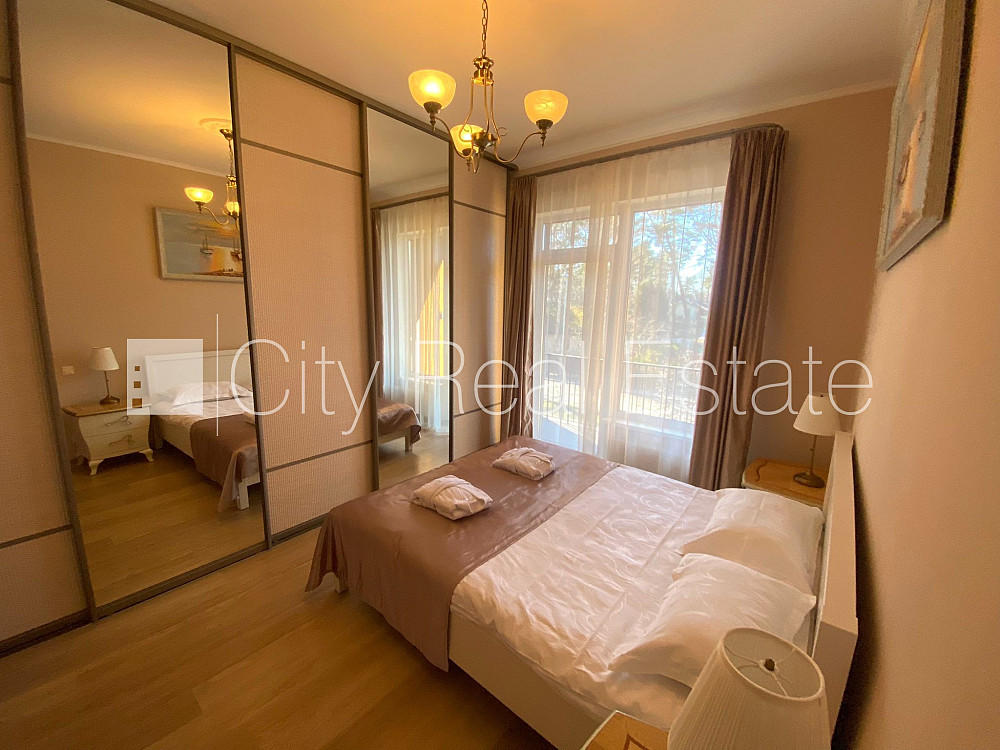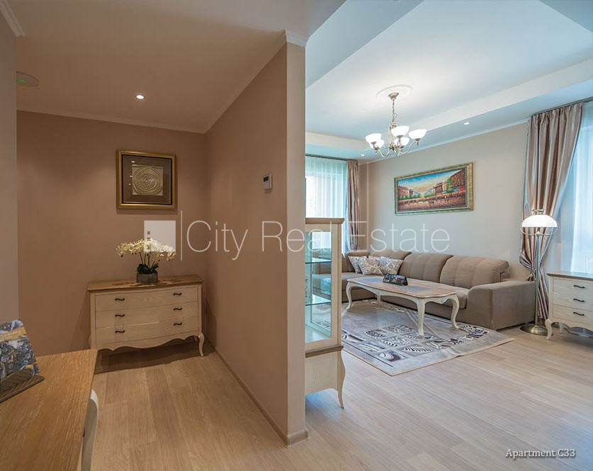 Jaunceltne, labiekārtota apzaļumota teritorija, slēgts pagalms, pazemes autostāvvieta, lodžija, guļamistabu skaits 2 gab., viesistaba, studio tipa, virtuve apvienota ar viesistabu, kamīns, apkures skaitītāji, individuāla apkures sistēmas uzskaite, divi sanitārie mezgli, vanna, dušas kabīne, iebūvēta virtuves iekārta, iebūvēti sienas skapji, atpūtas krēsli, televizors, ledusskapis, trauku mazgājamā mašīna, elektriskā plīts, cepeškrāsns, internets, diennakts apsardze, kāpņu telpā koda atslēga, nodots ekspluatācijā 2015. gadā, līdz parkam 150 m, līdz jūrai 300 m, CITY REAL ESTATE ID - 517243