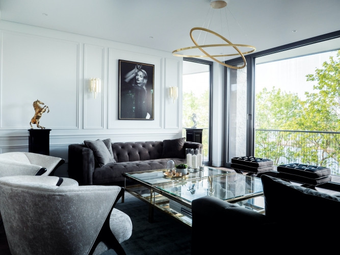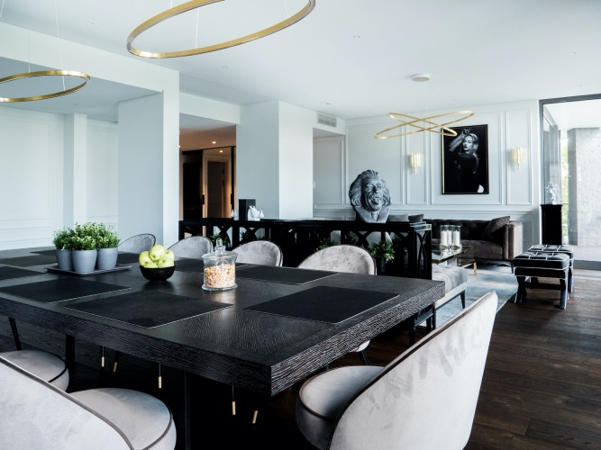 No šī valdzinošā dzīvokļa plašajiem logiem paveras elpu aizraujošs skats uz upi un Vecrīgu, nodrošinot lielisku fonu atpūtai un spēku atjaunošanai. Mūsdienīgi klasiskais interjers ir gan stilīgs, gan ērts, ar augstākās klases apdari un klasiskiem elementiem. Atvērtā plānojuma virtuve un dzīvojamā istaba ar kopējo platību 100 m2, pārpludinās telpu ar dabisko gaismu, izceļot skaisto upes un pilsētas skatu. Ar 4 guļamistabām un 3 vannas istabām, būs pietiekami daudz vietas plašai ģimenei. Saimnieku guļamistabā ir plaša garderobe un privāta vannas istaba, kur guļot vannā varēsiet baudīt skaistu skatu uz Vecrīgu. Dzīvokļa 6 balkoni nodrošinās arī plašu ārtelpu. Dzīvoklim ir veļas un saimniecības telpa. Dzīvoklis aprīkots ar augstas klases mēbelēm. Dzīvokļa tuvumā atrodas vairāki parki un zaļās zonas pastaigām. Rīgas centrs atrodas tikai 10 minūšu gājiena vai 5 minūšu brauciena attālumā. Dzīvoklis tiek izīrēts kopā ar 4 autostāvvietām un noliktavas telpu. Blakus ēkai ir pat vieta, kur turēt savu jahtu. Dzīvokļa plānojums- ar virtuvi apvienota plaša dzīvojamā istaba ar 4 balkoniem. Saimnieku guļamistaba ar plašu garderobi un vannas istabu, kā arī balkonu, pretējā pusē ir divas guļamistabas bērniem ar kopēju vannas istabu. Kā arī papildus viesu guļamistaba ar privātu vannas istabu, kā arī viesu tualete un veļas telpa ar atsevišķu ieeju personālam. Dzīvokļa kopējā platība 286m2, ar 240m2 dzīvojamo platību un 46m2 balkoniem. Dzīvoklī ir moderna ventilācijas sistēma un kondicionieri, kas ļaus izveidot ideālu mikroklimatu. Mūsdienīgi, klusi lifti un konsjeržs un video skatīšanās. Viens dzīvoklis stāvā ļaus baudīt izteiktu privātumu.