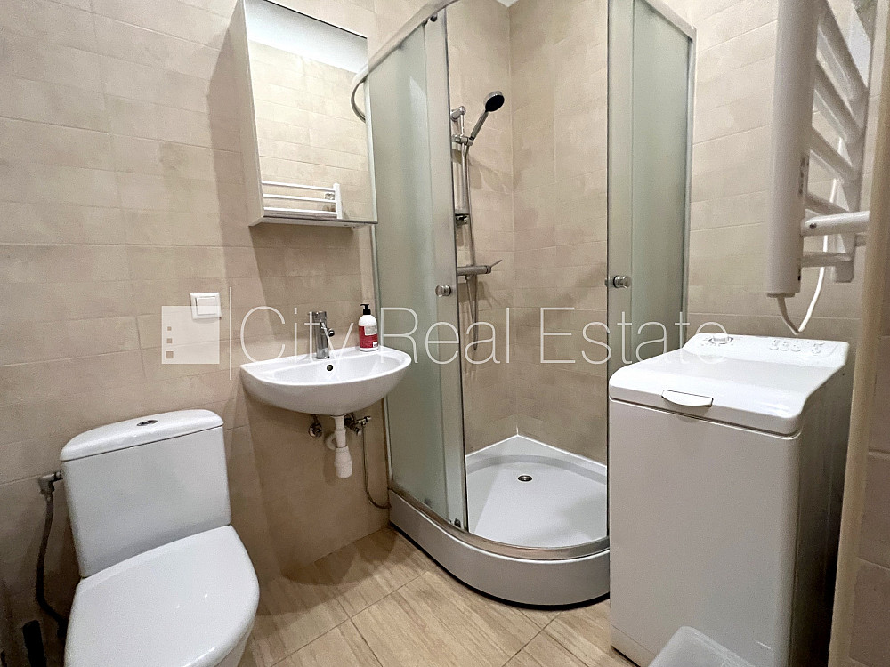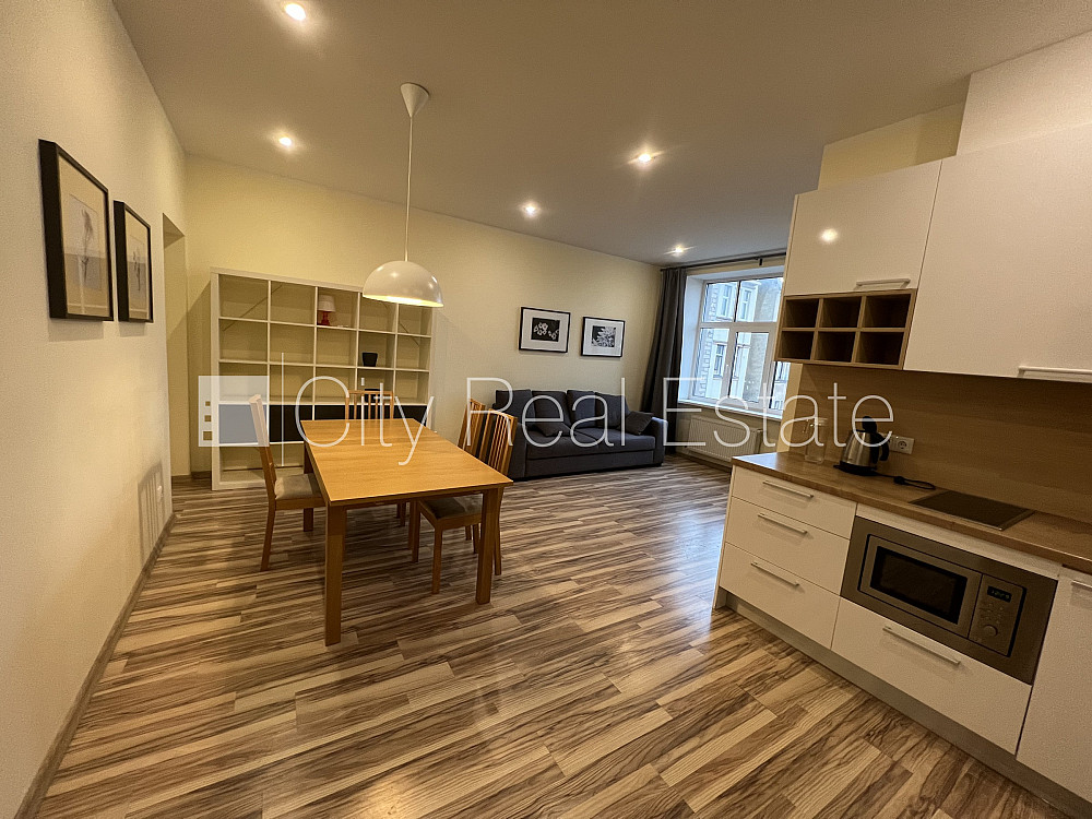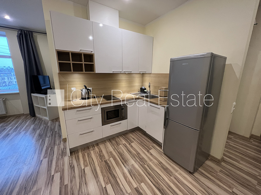 Fasādes māja, renovēta māja, labiekārtota apzaļumota teritorija, slēgts pagalms, iespēja nomāt autostāvvietu, ieeja no ielas un pagalma, guļamistabu skaits 1 gab., studio tipa, virtuve apvienota ar viesistabu, halle, mainīti radiatori, centrālā apkure, pilnā apdare, plastikāta stikla pakešu logi, metāla durvis, krāsotas sienas, jauna santehnika, lamināta parketa grīda, flīžu grīdas segums, sanitārais mezgls apvienots, dušas kabīne, iebūvēta virtuves iekārta, iebūvēti sienas skapji, dīvāns, divguļamā gulta, galds, virtuves galds, virtuves krēsli, televizors, ledusskapis, elektriskā plīts, tvaika nosūcējs, mikroviļņu krāsns, veļas mašīna, internets, slēgta kāpņu telpa, kāpņu telpā koda atslēga, atbrīvots, stratēģiski izdevīga vieta, CITY REAL ESTATE ID - 505123