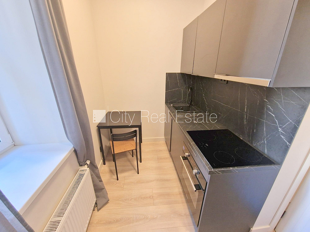 Fasādes māja, renovēta māja, slēgts pagalms, apsargāta teritorija, ieeja no ielas un pagalma, ir lifts, kāpņu telpa pēc kapitālā remonta, logi vērsti uz pagalma pusi, studio tipa, virtuve apvienota ar istabu, augstie griesti, centrālā apkure, plastikāta stikla pakešu logi, krāsotas sienas, jauna santehnika, lamināta parketa grīda, sanitārais mezgls apvienots, dušas kabīne, tualete, iebūvēta virtuves iekārta, iebūvēti sienas skapji, izvelkamais stūra dīvāns, virtuves galds, krēsli, ledusskapis, elektriskā plīts, cepeškrāsns, tvaika nosūcējs, veļas mašīna, slēgta kāpņu telpa, izīrē ar visu bildēs redzamo aprīkojumu, uz deviņiem mēnešiem, uz 1 gadu, uz 2 gadiem, ar iespēju pagarināt līgumu, atbrīvots, slēdzot īres līgumu, Jums būs jāmaksā par pirmo īres mēnesi , kā arī jāiemaksā drošības depozīts, izvēloties šo īpašumu, komisijas maksa par starpniecības pakalpojumiem ir vienāda ar vienu pusi (50%) no šī īpašuma viena mēneša īres maksas, CITY REAL ESTATE ID - 518037