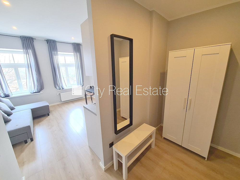 Fasādes māja, renovēta māja, slēgts pagalms, ieeja no ielas un pagalma, kāpņu telpa pēc kapitālā remonta, logi vērsti uz ielas pusi, studio tipa, virtuve apvienota ar istabu, augstie griesti, centrālā apkure, pilnā apdare, plastikāta stikla pakešu logi, krāsotas sienas, jauna santehnika, lamināta parketa grīda, flīžu grīdas segums, sanitārais mezgls apvienots, dušas kabīne, tualete, iebūvēta virtuves iekārta, izvelkamais stūra dīvāns, virtuves galds, krēsli, skapis, ledusskapis, elektriskā plīts, cepeškrāsns, tvaika nosūcējs, veļas mašīna, slēgta kāpņu telpa, izīrē ar visu bildēs redzamo aprīkojumu, atbrīvots, slēdzot īres līgumu, Jums būs jāmaksā par pirmo īres mēnesi , kā arī jāiemaksā drošības depozīts viena mēneša īres maksas apmērā, izvēloties šo īpašumu, komisijas maksa par starpniecības pakalpojumiem ir vienāda ar vienu pusi (50%) no šī īpašuma viena mēneša īres maksas, CITY REAL ESTATE ID - 515118