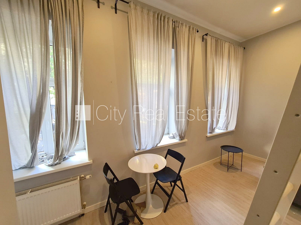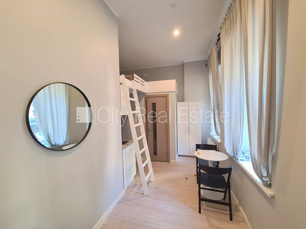 Fasādes māja, renovēta māja, slēgts pagalms, ieeja no ielas un pagalma, kāpņu telpa pēc kapitālā remonta, logi vērsti uz pagalma pusi, divstāvīgs, studio tipa, virtuve apvienota ar istabu, augstie griesti, centrālā apkure, pilnā apdare, koka stikla pakešu logi, krāsotas sienas, jauna santehnika, lamināta parketa grīda, flīžu grīdas segums, sanitārais mezgls apvienots, dušas kabīne, tualete, iebūvēta virtuves iekārta, dīvāns, skapis, ledusskapis, elektriskā plīts, cepeškrāsns, tvaika nosūcējs, veļas mašīna, slēgta kāpņu telpa, izīrē ar visu bildēs redzamo aprīkojumu, atbrīvots, slēdzot īres līgumu, Jums būs jāmaksā par pirmo īres mēnesi , kā arī jāiemaksā drošības depozīts viena mēneša īres maksas apmērā, izvēloties šo īpašumu, komisijas maksa par starpniecības pakalpojumiem ir vienāda ar vienu pusi (50%) no šī īpašuma viena mēneša īres maksas, CITY REAL ESTATE ID - 510442