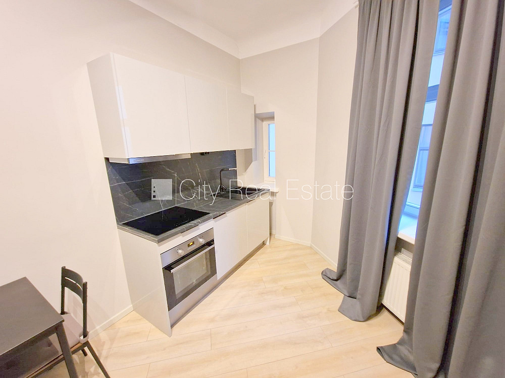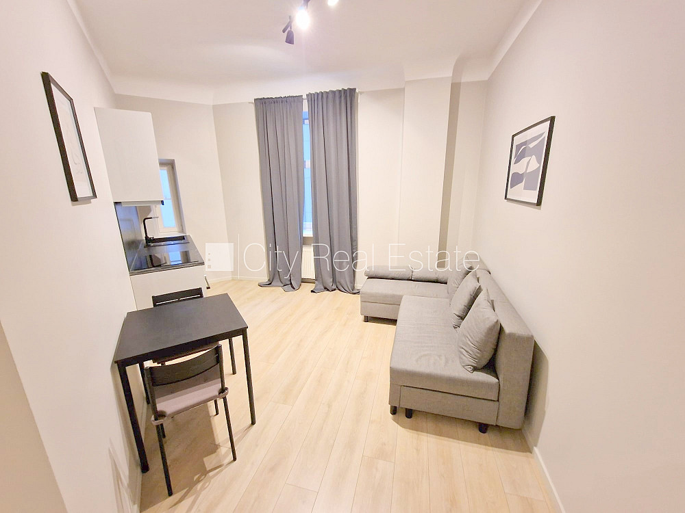 Fasādes māja, renovēta māja, slēgts pagalms, ieeja no ielas un pagalma, ir lifts, kāpņu telpa pēc kapitālā remonta, logi vērsti uz pagalma pusi, viena istaba izolēta, studio tipa, virtuve apvienota ar istabu, augstie griesti, centrālā apkure, pilnā apdare, koka stikla pakešu logi, krāsotas sienas, jauna santehnika, lamināta parketa grīda, flīžu grīdas segums, sanitārais mezgls apvienots, dušas kabīne, tualete, iebūvēta virtuves iekārta, dīvāns, gulta , virtuves galds, krēsli, skapis, ledusskapis, elektriskā plīts, cepeškrāsns, tvaika nosūcējs, veļas mašīna, slēgta kāpņu telpa, izīrē ar visu bildēs redzamo aprīkojumu, atbrīvo augustā, slēdzot īres līgumu, Jums būs jāmaksā par pirmo īres mēnesi , kā arī jāiemaksā drošības depozīts viena mēneša īres maksas apmērā, izvēloties šo īpašumu, komisijas maksa par starpniecības pakalpojumiem ir vienāda ar vienu pusi (50%) no šī īpašuma viena mēneša īres maksas, CITY REAL ESTATE ID - 512408