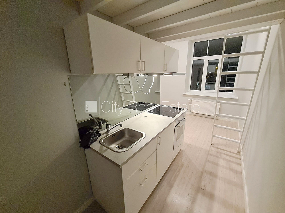 Fasādes māja, renovēta māja, slēgts pagalms, ieeja no ielas, kāpņu telpa pēc kapitālā remonta, logi vērsti uz pagalma pusi, divstāvīgs, studio tipa, virtuve apvienota ar istabu, augstie griesti, centrālā apkure, pilnā apdare, plastikāta stikla pakešu logi, krāsotas sienas, jauna santehnika, lamināta parketa grīda, flīžu grīdas segums, sanitārais mezgls apvienots, dušas kabīne, tualete, iebūvēta virtuves iekārta, dīvāns, virtuves galds, krēsli, skapis, ledusskapis, elektriskā plīts, cepeškrāsns, tvaika nosūcējs, veļas mašīna, slēgta kāpņu telpa, izīrē ar visu bildēs redzamo aprīkojumu, atbrīvots, slēdzot īres līgumu, Jums būs jāmaksā par pirmo īres mēnesi , kā arī jāiemaksā drošības depozīts viena mēneša īres maksas apmērā, izvēloties šo īpašumu, komisijas maksa par starpniecības pakalpojumiem ir vienāda ar vienu pusi (50%) no šī īpašuma viena mēneša īres maksas, CITY REAL ESTATE ID - 511342