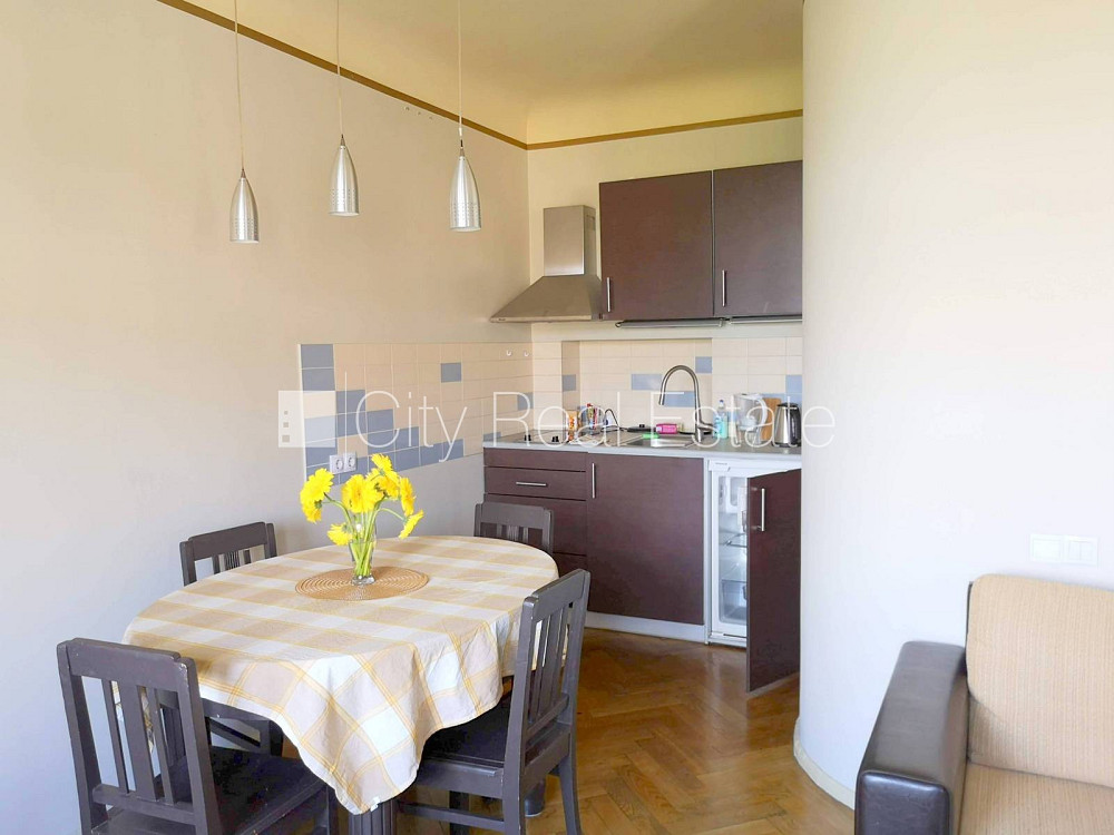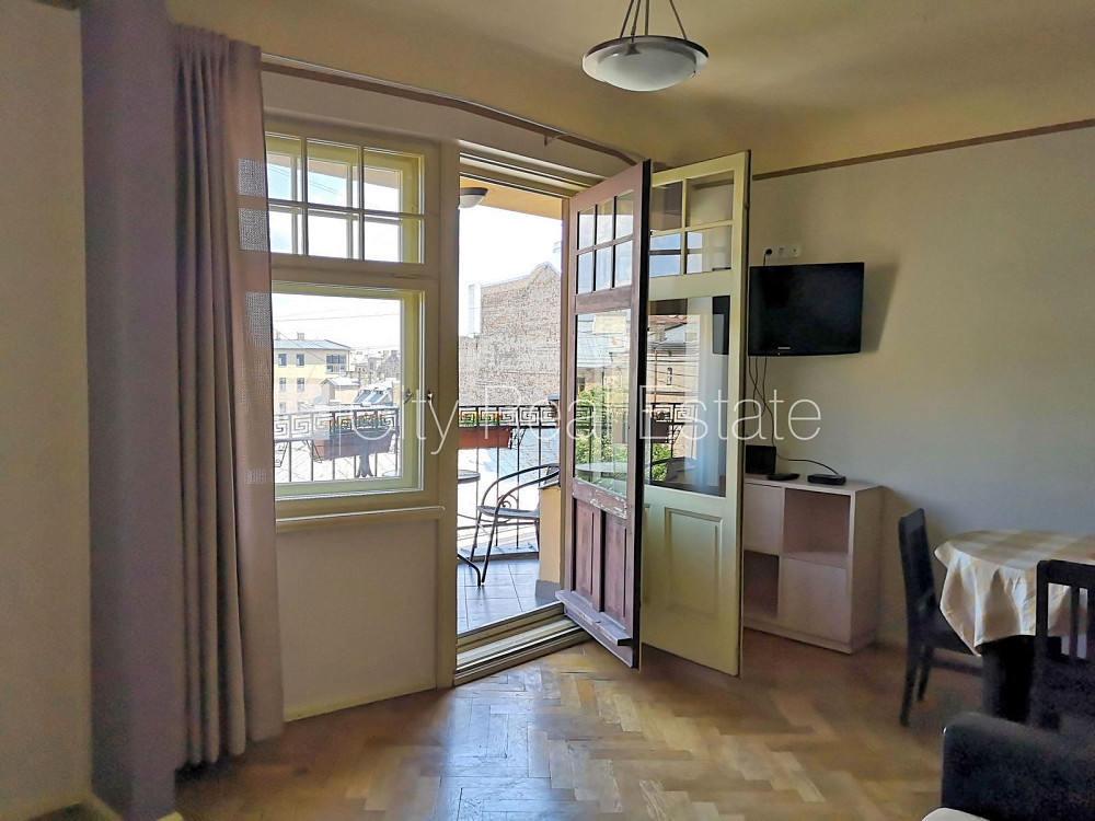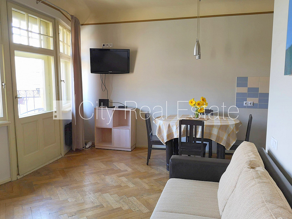 Fasādes māja, ieeja no ielas, ir lifts, balkons, studio tipa, virtuve apvienota ar viesistabu, augstie griesti, centrālā apkure, jauna santehnika, parketa grīda, flīžu grīdas segums, sanitārais mezgls apvienots, dušas kabīne, iebūvēta virtuves iekārta, dīvāns, gulta , virtuves galds, žurnālu galdiņš, krēsli, virtuves krēsli, divdurvju skapis, televizors, ledusskapis, tvaika nosūcējs, veļas mašīna, internets, kabeļtelevīzija, kāpņu telpā koda atslēga, atbrīvots, līdz lidostai , līdz veikalam, līdz tramvaja pieturai, līdz autobusa pieturai, slēdzot īres līgumu, Jums būs jāmaksā par pirmo īres mēnesi , kā arī jāiemaksā drošības depozīts, izvēloties šo īpašumu, komisijas maksa par starpniecības pakalpojumiem ir vienāda ar vienu pusi (50%) no šī īpašuma viena mēneša īres maksas, CITY REAL ESTATE ID - 424088