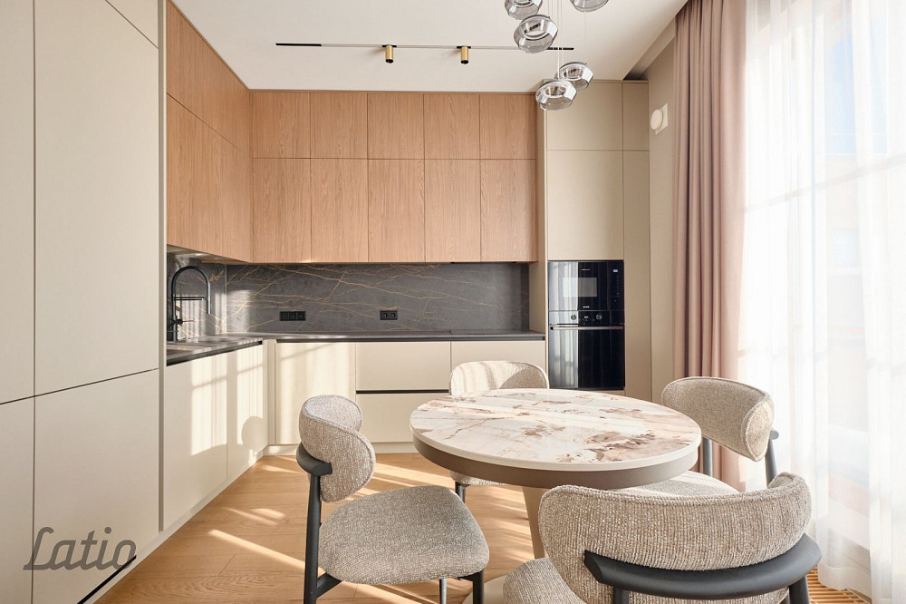 Dzīvokļa apdarē izmantoti kvalitatīvi un augstvērtīgi būvniecības materiāli, kā arī dizains veidots pēc pēdējām modes tendencēm.