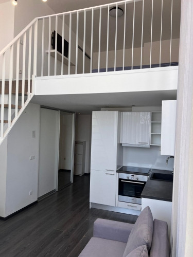 Izīrē modernu, loft stila divstāvu dzīvokli ar augstiem griestiem un plašiem logiem, kas 530 EUR