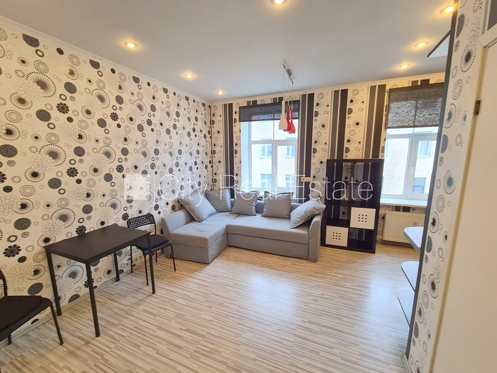 Pagalma ēka, renovēta māja, slēgts pagalms, ieeja no pagalma, ir lifts, kāpņu telpa pēc kosmētiskā remonta, logi vērsti uz pagalma pusi, studio tipa, virtuve apvienota ar istabu, augstie griesti, centrālā apkure, plastikāta stikla pakešu logi, metāla durvis, izlīmētas tapetes, krāsotas sienas, jauna santehnika, lamināta parketa grīda, flīžu grīdas segums, sanitārais mezgls apvienots, dušas kabīne, tualete, iebūvēta virtuves iekārta, iebūvēti sienas skapji, izvelkamais stūra dīvāns, virtuves galds, krēsli, ledusskapis, trauku mazgājamā mašīna, gāzes plīts, tvaika nosūcējs, veļas mašīna, slēgta kāpņu telpa, izīrē ar visu bildēs redzamo aprīkojumu, uz 1 gadu, uz 2 gadiem, ar iespēju pagarināt līgumu, atbrīvots, slēdzot īres līgumu, Jums būs jāmaksā par pirmo īres mēnesi , kā arī jāiemaksā drošības depozīts viena mēneša īres maksas apmērā, izvēloties šo īpašumu, komisijas maksa par starpniecības pakalpojumiem ir vienāda ar vienu pusi (50%) no šī īpašuma viena mēneša īres maksas, CITY REAL ESTATE ID - 515054
