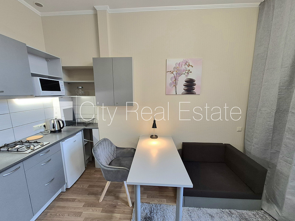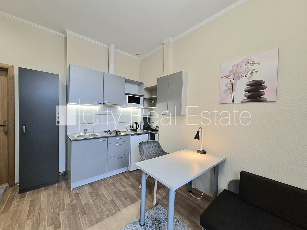 Pagalma ēka, slēgts pagalms, ieeja no pagalma, beletāža, logi vērsti uz pagalma pusi, viena istaba izolēta, studio tipa, virtuve apvienota ar istabu, gāzes apkure, jauna santehnika, sanitārais mezgls apvienots, dušas kabīne, iebūvēta virtuves iekārta, divguļamā gulta, virtuves galds, atpūtas krēsli, skapis, spogulis, ledusskapis, gāzes plīts, tvaika nosūcējs, mikroviļņu krāsns, veļas mašīna, galda lampa, spilveni, gultas veļa, trauki, atbrīvots, izvēloties šo īpašumu, komisijas maksa par starpniecības pakalpojumiem ir vienāda ar vienu pusi (50%) no šī īpašuma viena mēneša īres maksas, CITY REAL ESTATE ID - 517996