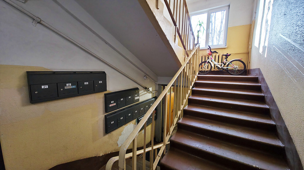 + Renovēta kāpņu telpa, nomainīti logi, tiek uzturēta tīrība, ārdurvis ir aprīkotas ar koda atslēgu ar čipu un domofonu;