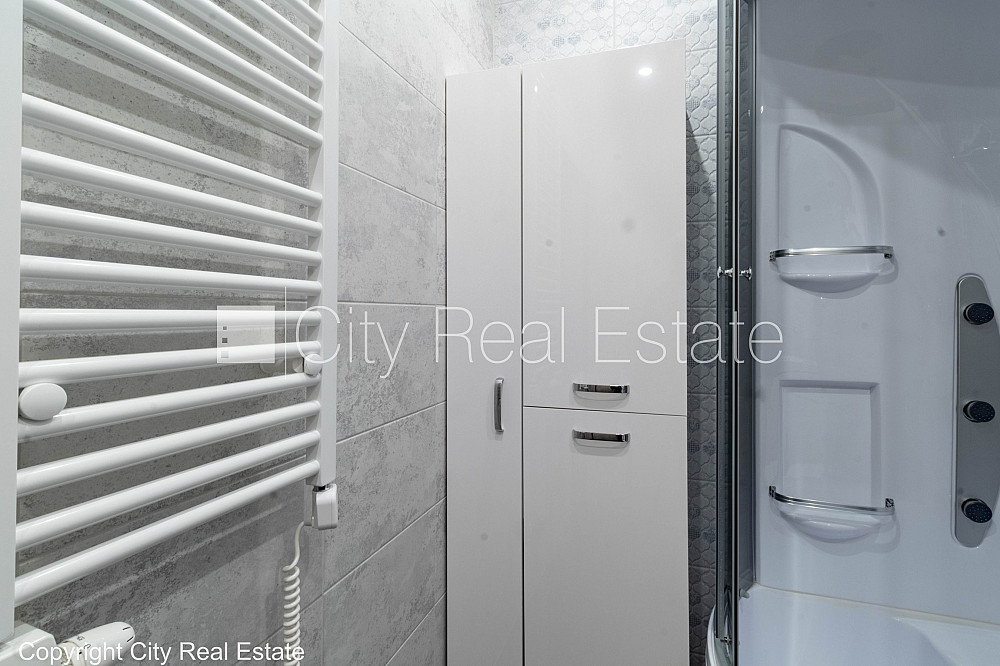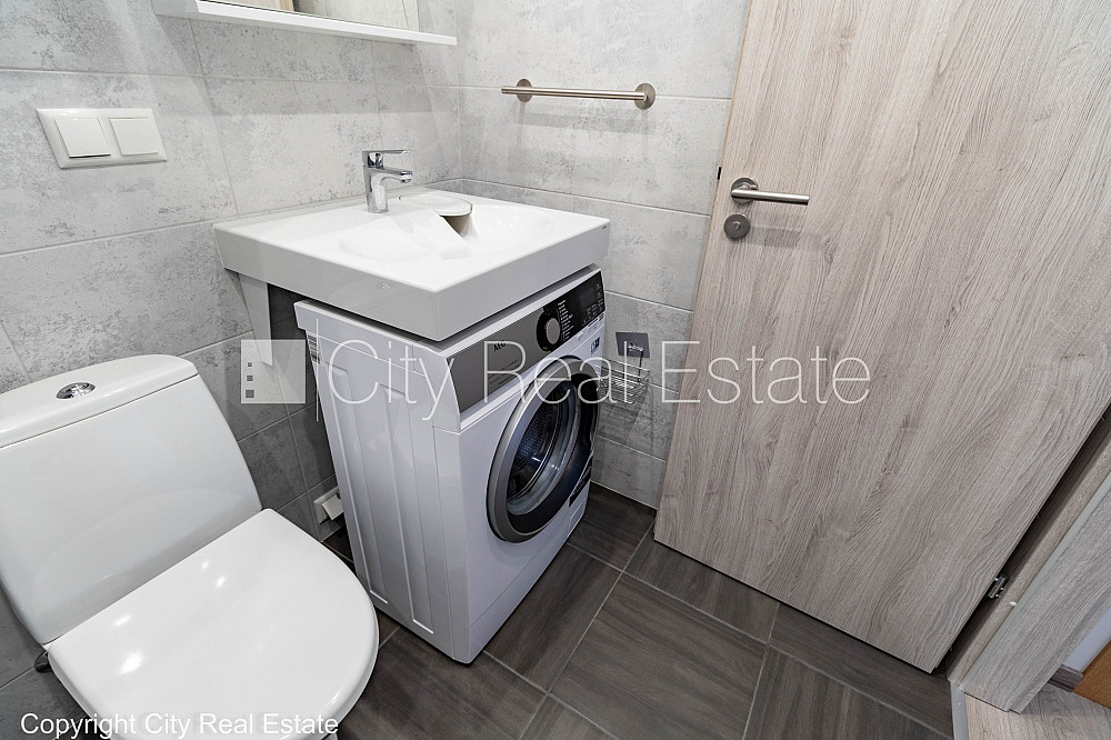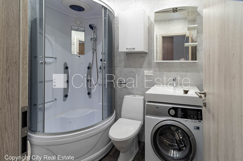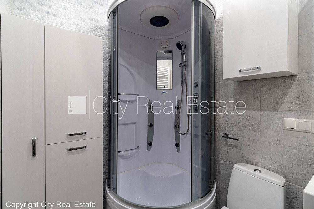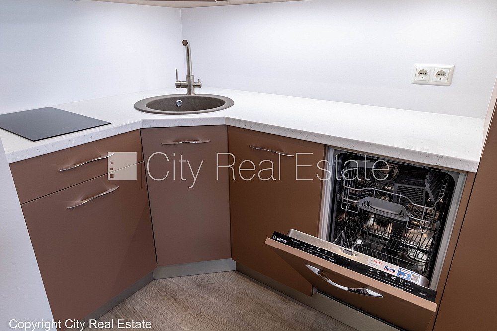 Jaunceltne, fasādes māja, labiekārtots apzaļumots pagalms, iežogota teritorija ar metāla sētu, teritorijas iebrauktuves vārti aprīkoti ar automatizētu atvēršanās un aizvēršanās sistēmu, vieta automašīnai, ir lifts, balkons 3.6 m2, logi vērsti uz ielas pusi, plašs skats no loga, studio tipa, virtuve apvienota ar istabu, palīgtelpas pagrabstāvā 6 m2, automatizēta apkures sistēma, plastikāta stikla pakešu logi, lamināta parketa grīda, flīžu grīdas segums, sanitārais mezgls apvienots, džakūzī dušas kabīne, iebūvēta virtuves iekārta, iebūvēti sienas skapji, izvelkamais stūra dīvāns, bāra lete, bāra krēsli, kumode, ledusskapis, trauku mazgājamā mašīna, elektriskā plīts, cepeškrāsns, tvaika nosūcējs, veļas mašīna, optiskais internets, namrunis, diennakts videonovērošana, slēgta kāpņu telpa, pārdod ar visu bildēs redzamo aprīkojumu, atbrīvots, reģistrēts zemesgrāmatā, stratēģiski izdevīga vieta, CITY REAL ESTATE ID - 517742