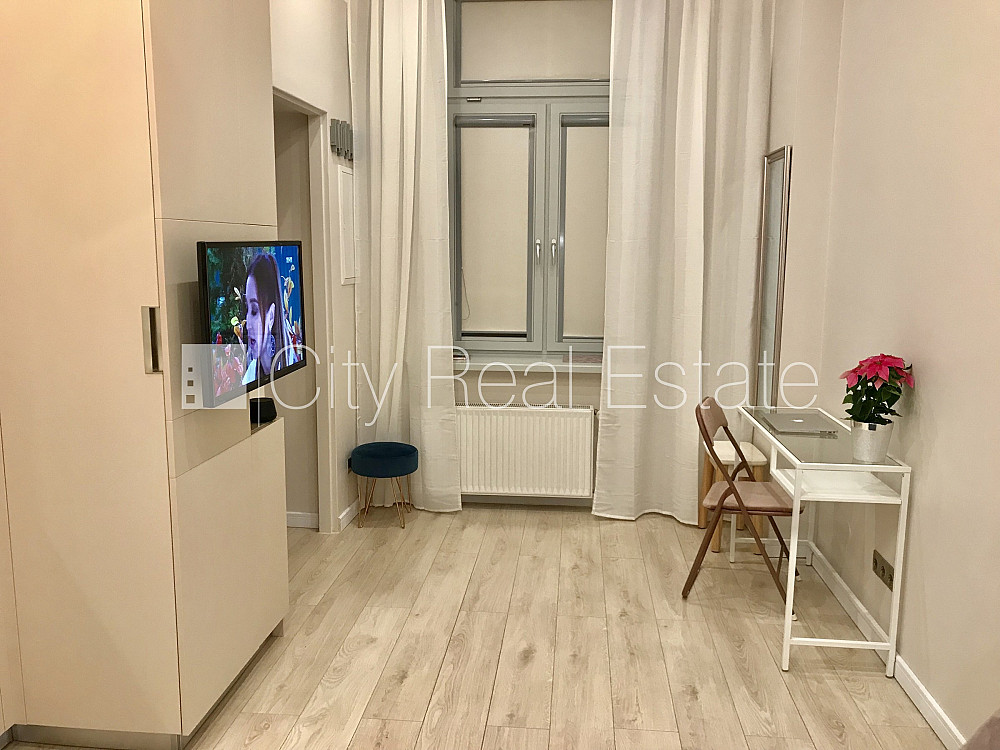 Renovēta māja, slēgts pagalms, ir lifts, kāpņu telpa pēc kapitālā remonta, studio tipa, virtuve apvienota ar istabu, krāsotas sienas, jauna santehnika, parketa grīda, sanitārais mezgls apvienots, vanna, iebūvēta virtuves iekārta, iebūvēti sienas skapji, dīvāns, gulta , televizors, ledusskapis, elektriskā plīts, tvaika nosūcējs, veļas mašīna, internets, diennakts videonovērošana, kāpņu telpā koda atslēga, CITY REAL ESTATE ID - 517792