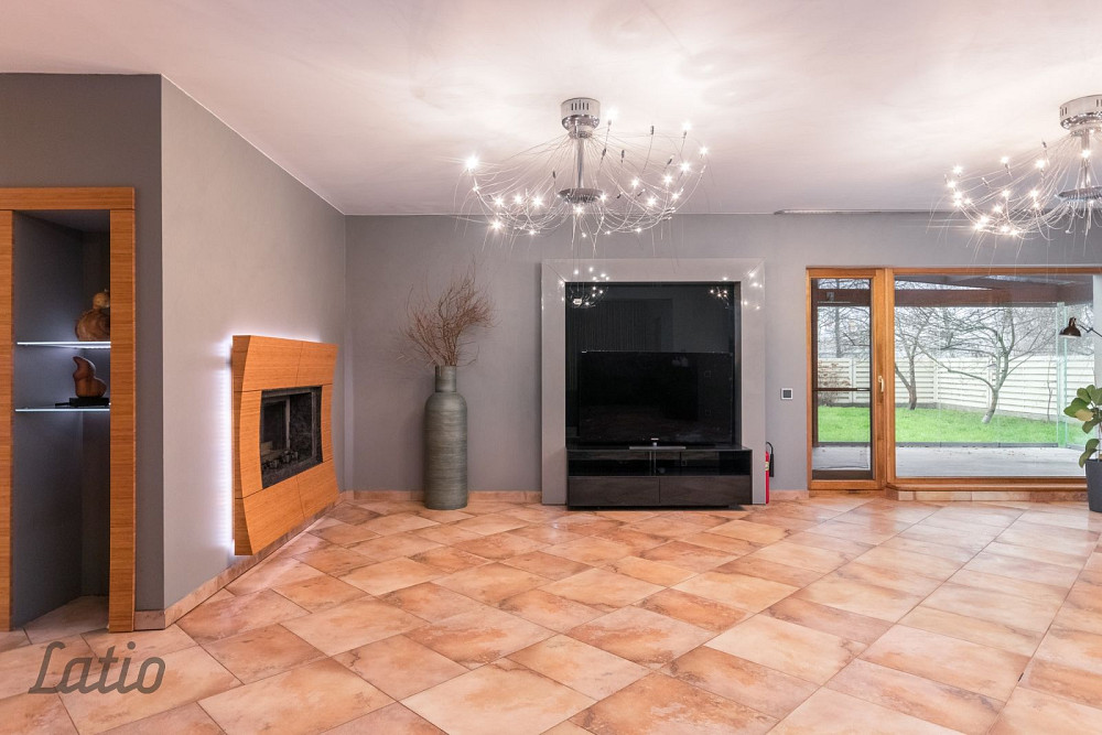Plaša un gaiša viesistaba ar modernu, pilnībā aprīkotu virtuvi. Telpa organiski savienojas ar iestikloto terasi, kas aprīkota ar apsildi, lai to varētu izmantot visu gadu. Šajā stāvā atrodas arī garderobes telpa, labierīcības un atsevišķa veļas mazgāšanas telpa ar AEG veļas mašīnu un Miele žāvētāju. Viesistabā uzstādīts kvalitatīvs AGNI (Francija) kamīns, kas piešķir mājoklim īpašu atmosfēru. Garāža ar automātiskajiem vārtiem.