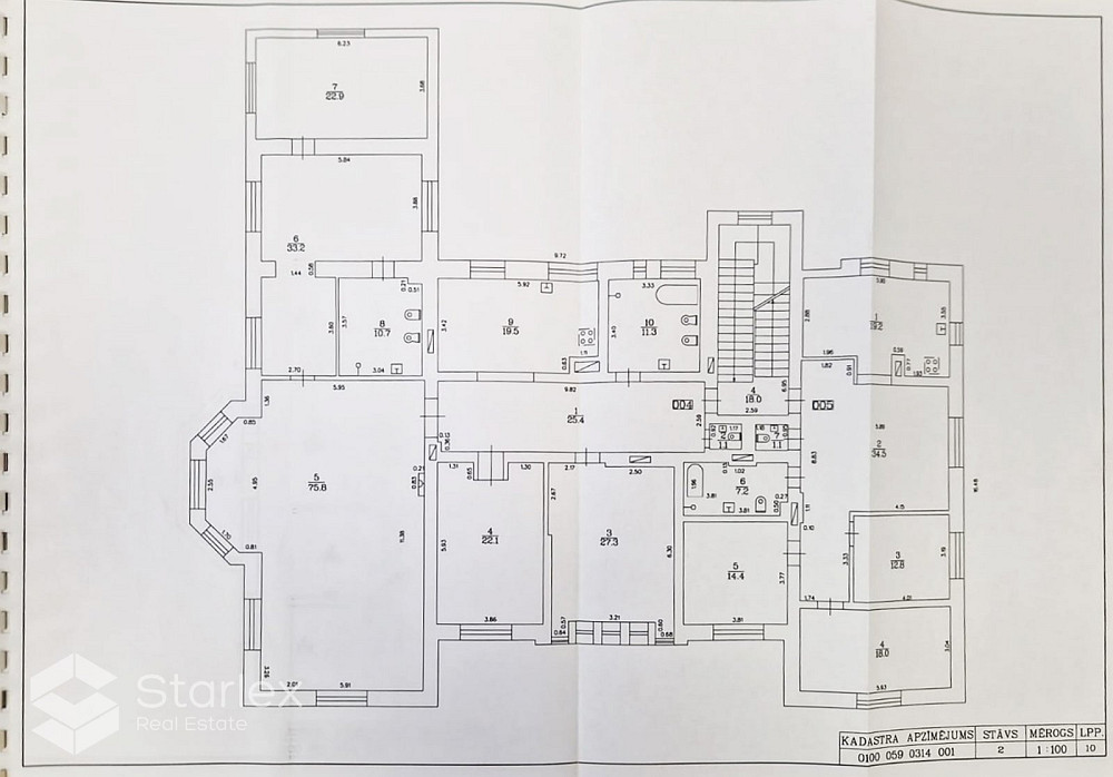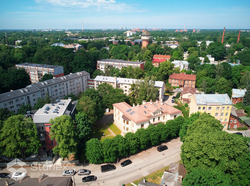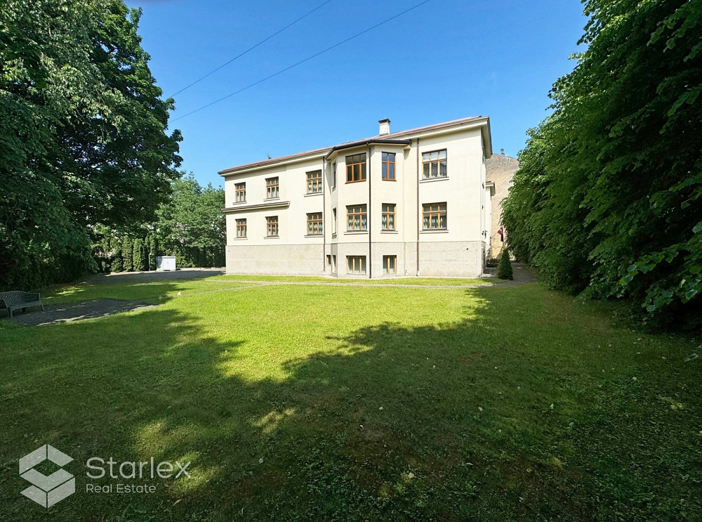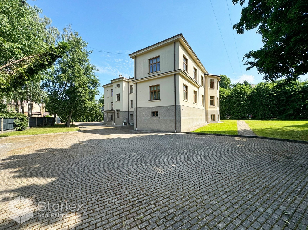 Pārdod reprezentablu dzīvokļu un biroju ēku Ernestīnes ielā 6, Āgenskalnā. Pirmskara laikā celtā 4-stāvu ķieģeļu mūra ēka tika renovēta un nodota ekspluatācijā 2008. gadā. Mājas kopējā platība ir 1336 m2, lietderīgā platība - 1271 m2. Lieliska atrašanās vieta tikai 2,5 km attālumā no Rīgas centra.Ēka sastāv no vairākām telpu grupām:1) Ēkas pirmajā stāvā atrodas biroja telpas ar kopējo platību 316,2 m2, tajā skaitā 27,5 m2 tehniskās telpas ēkas pagrabstāvā. Biroja telpas iespējams izmantot vienam lielam birojam vai vairākiem atsevišķiem birojiem. Trīs tualetes, dušas telpa, pirts telpa, divas virtuves telpas un virkne biroja telpu. 2) Pirmajā stāvā atrodas arī divas atsevišķas garāžas ar elektroauto uzlādes iespēju. 3) Ēkas 2. un 3. stāvā atrodas četri dzīvokļi: - divi līdzīga plānojuma pilnībā mēbelēti 6-istabu dzīvokļi (katrā 3 guļamistabas, 2 vannas istabas + atsevišķa tualete), dzīvokļu platība attiecīgi 249,3 m2 un 257,6 m2. - divi vienāda plānojuma 5-istabu dzīvokļi (katrā 3 guļamistabas, vannas istaba + atsevišķa tualete), dzīvokļu platība attiecīgi 107,2 m2 un 107,5 m2. 2. un 3. stāva dzīvokļos augsti griesti no 3,0 līdz 3,2 metri. 4) Ēkas 4. stāvā viens liels mansarda dzīvoklis ar izmantojamo platību 188,2 m2. Dzīvoklī ir 4 istabas un 2 vannas istabas. Divas atsevišķas ieejas ēkā - no fasādes puses biroja telpās un no pagalma puses kāpņu telpā, no kuras iespējams nokļūt visos piecos mājā esošajos dzīvokļos. Abi lielie 250 m2 dzīvokļi nav bijuši apdzīvoti un izceļas ar augstvērtīgu apdari. Ozola un sarkankoka parkets, masīvkoka un mīkstās klasiska stila itāļu mēbeles, vienā no šiem dzīvokļiem grezns izsolē pirkts kamīns. Visi dzīvokļi ir aprīkoti ar santehniku un virtuves iekārtām un ir gatavi tūlītējai izmantošanai. Ēkā ir autonoma gāzes apkure. Īpašuma sastāvā ir zemes gabals ar kopējo platību 4978 m2, no kura pārdodamās ēkas lietošanā ir 2398 m2. Liela daļa zemes ir bruģēta ar iespēju novietot lielu skaitu automašīnu. Uz pārējās zemes daļas ir zālājs un koki. Nožogota teritorija ar diviem vārtiem uz Ernestīnes ielu un uz Kapseļu ielu. Zemes daļa ar platību 2580 m2 ir blakus esošās daudzdzīvokļu dzīvojamās mājas lietošanā, par ko tiek saņemta zemes lietošanas maksa 4000 EUR gadā.