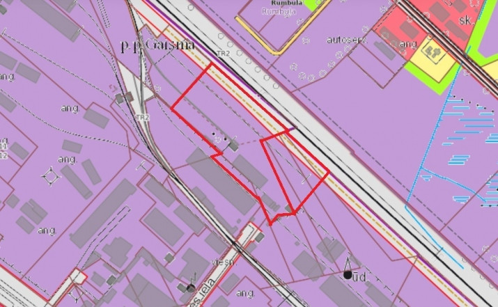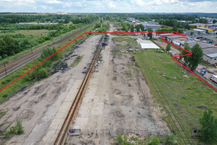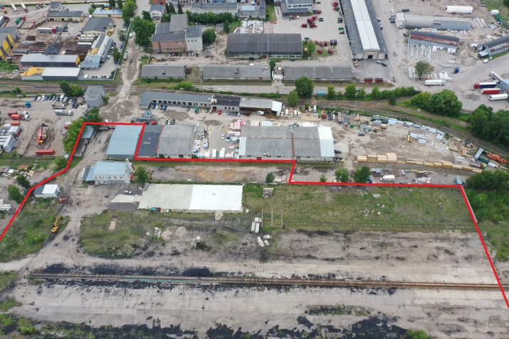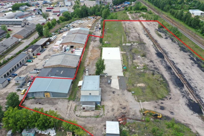 Asfaltēta teritorija ar 3 sliežu ievadiem un palīgceltnēm. Bijusī ogļu bāze. Teritorijā ienāk 3 dzelzceļa ievadi: 1) uz dzelzsbetona estakādes 400 m (īpašumā), 2) uz zemes 240 m (īpašumā), 3) uz zemes cauri teritorijai (LDz īpašums). Īpašumā ir: a) 2 stāvu biroju ēka, 382 kvm; 1.stāvā 3 garāžu boksi ar bedri, un ģērbtuves ar atpūtas telpu un dušu; 2.stāvā 8 kabineti un virtuve. Malkas centrāla apkure, pilsētas kanalizācija, ūdens spice. b) darbnīca 63 kvm, nesen atjaunota. c) metāla angārs bez apkures 500 kvm. d) noliktava 61 kvm. e) auto svari ar nojumi un svaru dispečeru ēka 27 kvm. Kā arī jauni dzelzsbetona pamati (grīda) 1200 kvm platībā angāru būvniecībai. Īpašumā ir arī teritorijā esošais asfalta segums. Īpašums atrodas rūpnieciskās apbūves teritorijā. Maza daļa zemes gar dzelzceļu atrodas transporta infrastruktūras teritorijas (TR1) zonējumā. Visu teritoriju vai daļu no tās iespējams arī nomāt.