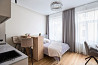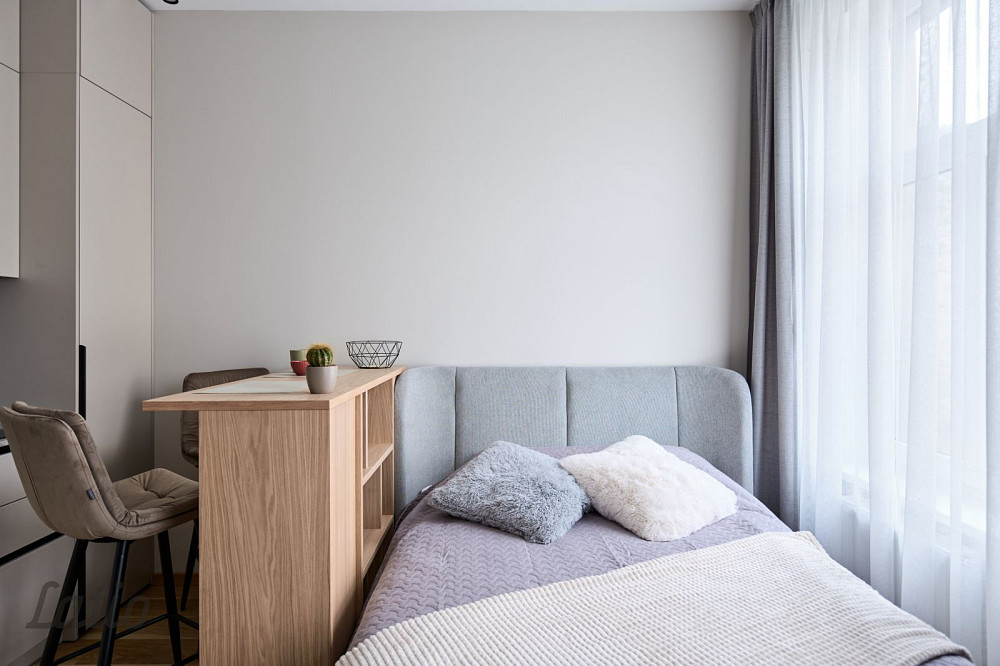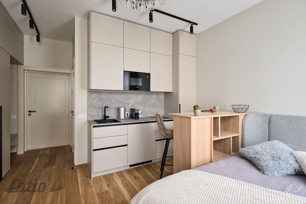+ Dzīvoklī ir studijas tipa viesistaba, kas apvienota ar virtuves zonu un guļamzonu, plaša priekštelpa un tualetes telpa ar dušu.
