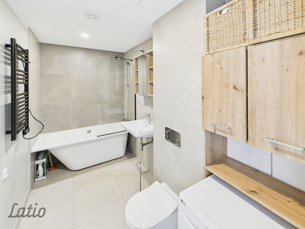 Dzīvoklis tiek izīrēts daļēji mēbelēts. Virtuve pilnībā aprīkota ar visu nepieciešamo sadzīves tehniku, trauku mazgājamo mašīnu, ledusskapi, cepeškrāsni, veļasmašīnu u.c. Dzīvoklī ir ērts plānojums: viesistaba apvienota ar virtuvi, izolēta guļamistaba, plaša vannas istaba ar vannu un dušu.