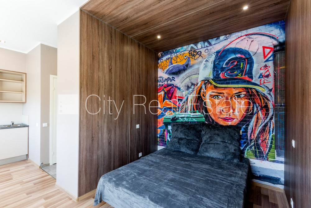 Реновированный дом, благоустроенная озеленённая территория, место для машины, лестничная клетка после капитального ремонта, студио, кухня объединена с комнатой, прачечная, центральное отопление, полы с подогревом в ванной, пластиковые стекло-пакетные окна, покрашенные стены, новая сантехника, ламинатный пол, совмещённый санузел, душевая кабина, встроенная кухня, встроенные стенные шкафы, двуспальная кровать, стол, журнальный столик, стулья, электрическая плита, вытяжка, интернет, круглосуточное видеонаблюдение, закрытая лестничная клетка, CITY REAL ESTATE ID - 423905