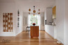 Viesistaba un ieejas zona ar individuāli izgatavotām mēbelēm, kas harmoniski saskaņotas ar dzīvokļa kopējo interjeru.