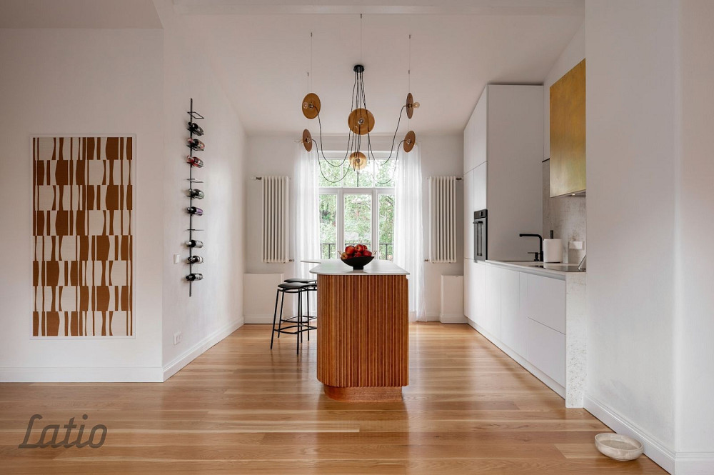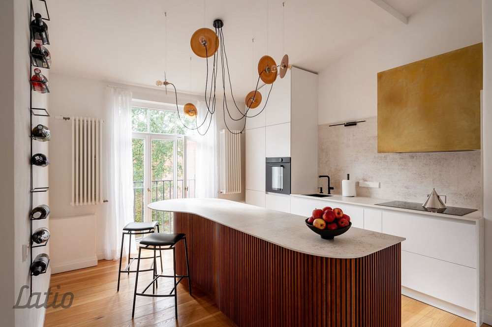 Fasādēs izmantots balts matēts akrils, koks un misiņš, kas piešķir eleganci un vieglumu.