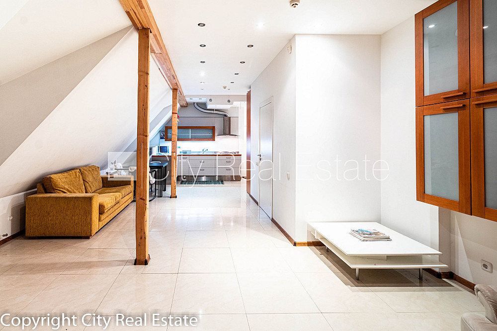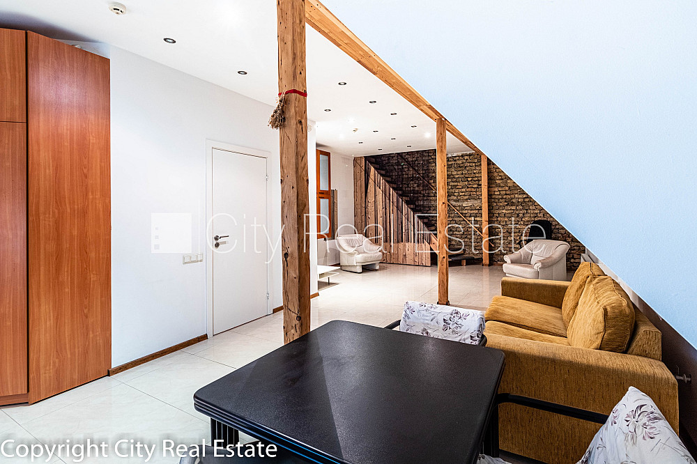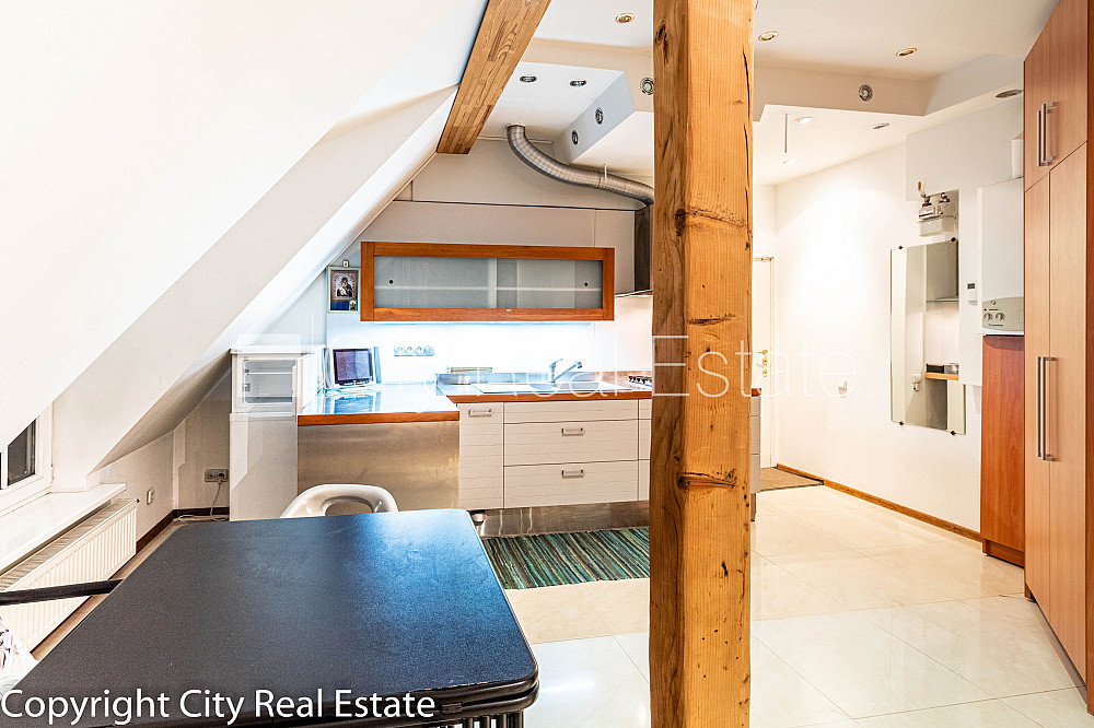 Фасадный дом, мансарда, двухэтажный, студио, кухня объединена с комнатой, газовое отопление, пластиковые стекло-пакетные окна, мансардные окна, ламинатный пол, кафельный пол, совмещённый санузел, два санузла, ванна, душевая кабина, встроенная кухня, встроенные стенные шкафы, диван, двуспальная кровать, кухонный стол, журнальный столик, барная стойка, барные стулья, кухонные стулья, шкаф, зеркало, одно помещение изолировано, лестничная клетка на кодовом замке, стратегически выгодное место, CITY REAL ESTATE ID - 516264