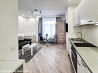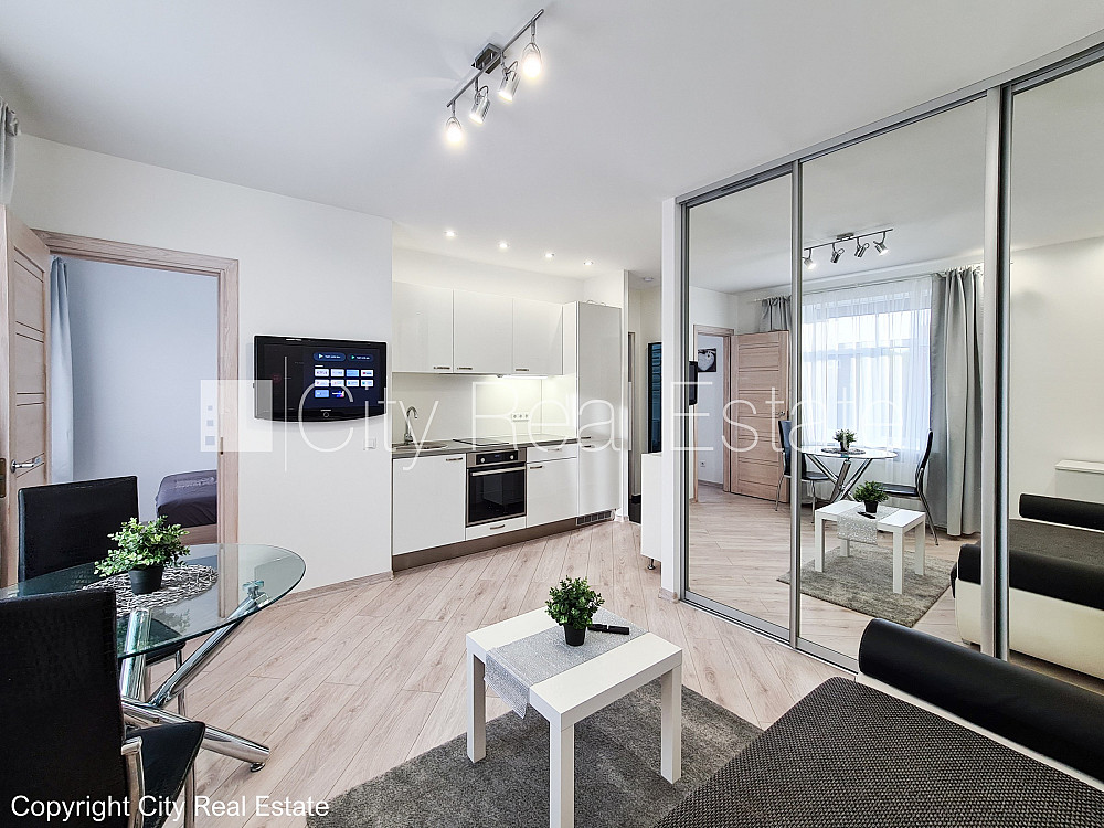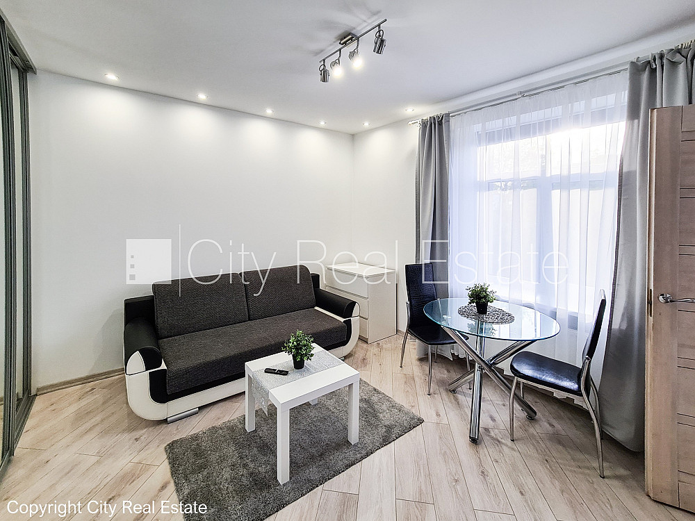 Фасадный дом, вход с улицы, лифт, балкон, студио, кухня объединена с гостинной, высокие потолки, центральное отопление, новая сантехника, паркетный пол, кафельный пол, совмещённый санузел, душевая кабина, встроенная кухня, диван, кровать, кухонный стол, журнальный столик, стулья, кухонные стулья, двухдверный шкаф, телевизор, холодильник, вытяжка, стиральная машина, интернет, кабельное телевидение, лестничная клетка на кодовом замке, освобождена, до аэропорта, до магазина, до остановки трамвая, до остановки автобуса, CITY REAL ESTATE ID - 424089