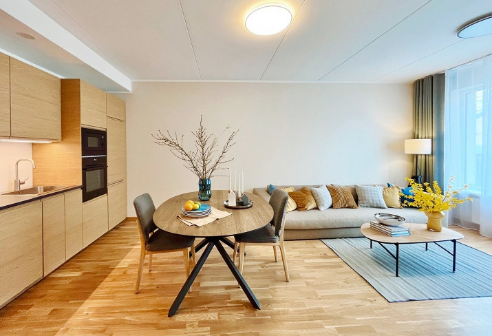 Новостройка на улице Вея 33 Новый проект в Торнякалнсе - всего 12 квартир в доме, есть подземные и наземные паркинги, кладовые. В наличии 2 и 3 комнатные квартиры площадью от 51,6 м до 67 м. Земля под домом находится в собственности, каждая квартира будет являться отдельной квартирной собственностью. КВАРТИРЫ Во всех апартаментах есть просторная гостиная, совмещенная с кухонной зоной, площадью от 30 м до 36 м. В каждой квартире одна или две спальни с большим окном и широким подоконником или французским балконом. Площадь изолированных номеров составляет от 10 м до 15 м. В санузле совмещенная, практичная и долговечная сантехника Duravit из Германии. Во всех ванных комнатах уже есть ванна с душем, гардеробная, зеркало и освещение. Установлены электрические полотенцесушители. В санузлах встроен подогрев пола. Трехкомнатная квартира площадью 60.8 м расположена на 3 этаже дома. Все окна выходят на восток(А) в тихий двор. Несколько фотографий из ДЕМО-квартиры. УЛИЦА ВЕЯ, ДОМ 33 Дом сдан в эксплуатацию в январе 2025 года. Класс энергоэффективности А (после временной оценки энергоэффективности). Высота потолков в квартирах от 2,5 м в санузлах до 2,85 м в квартирах на третьем этаже. Отопление Рижское тепло с индивидуальными счетчиками. Все счетчики отопление, потребление воды, электричество считываются удаленно. Имеется вентиляция с рекуперацией. Полы паркет, плитка и ковровая плитка. Шпонированная деревянная дверь со скрытыми петлями и магнитным ключом. Установлены видеокамеры охраны, детекторы дыма, эвакуационное освещение, опции сигнализации, сигнализация в каждой квартире. Имеется оптическое подключение к Интернету ТЕТ. ТЕРРИТОРИЯ ДОМА Доступ в мощеный, благоустроенный и освещенный двор с зоной отдыха и детским игровым уголком открывается с помощью пульта дистанционного управления. За дополнительную плату можно приобрести наземные парковочные места, подземные парковочные места и складские помещения. Управлять домом будет компания ФРАМС менеджер с большим опытом управления небольшими жилыми домами. РАСПОЛОЖЕНИЕ И РАЙОНЫ Торнякалнс один из самых зеленых районов Риги с многовековой историей. В настоящее время район переживает бурное развитие и рост. Этому способствует близкое расположение к историческому центру Риги и развитая транспортная инфраструктура, позволяющая легко добраться практически до всех направлений в центре Риги, Пардаугавы и Пиериги. На расстоянии 500 м от дома Веяс 33 находятся 23, 26, 44 и 46 автобусные остановки, 10 трамвайных остановок и 27 троллейбусных остановок. Вдоль Виенибас гатви проходит велосипедная дорожка, которая соединяет Зиепниекалну с центром Риги. Быстрое и удобное движение на автомобиле обеспечивают Акменские склоны до центра Риги 1015 минут, до Юглы можно добраться за 2535 минут через Салу или Южный мост. Рядом находится широкий спектр дошкольных и школьных образовательных учреждений, образовательных, спортивных, художественных и других дополнительных занятий. Академический центр LU в 1,5 км. Раз