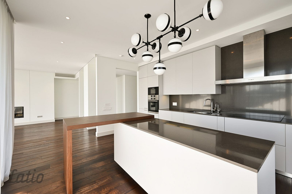 Interjera dizainā savijas minimālisms un industriālā stila elementi pelēkie toņi mijas ar siltu koku, bet uzmanības centrā ir unikālas formas lampas, kas piešķir katrai telpai savu raksturu. Virtuves aprīkojumā izmantota augstākās klases sadzīves tehnika, un visa apdare veikta ar premium līmeņa materiāliem, kas uzsver kvalitāti un ilgmūžību.