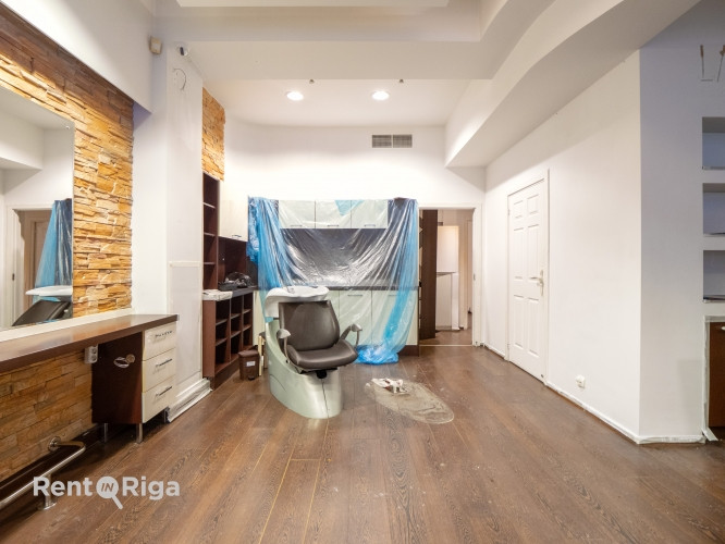 Salon or retail premises with large display windows. Previously, the premises housed a hairdressing and beauty salon. The furniture and equipment shown in the photos can be purchased separately. On the ground floor there is a large hall (77 sqm), 2 rooms, and a toilet. On the second floor there is an office and a staff room with a kitchenette. Ground floor: 101 sqm, second floor: 47 sqm. Currently, there are 4 points for connecting sinks on the ground floor. Gas heating boiler shared with the neighboring shop. Air conditioning. Real estate tax: EUR 0.56/sqm. Maintenance fee: EUR 0.50/sqm.